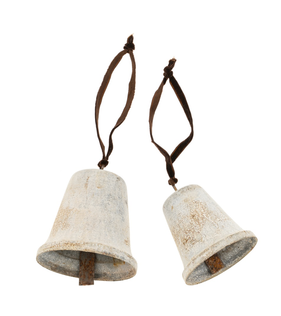 This set of two bells in varying sizes features a beautifully aged patina finish, giving them a vintage, timeworn appeal. Suspended from soft velvet ties, they bring a touch of rustic elegance