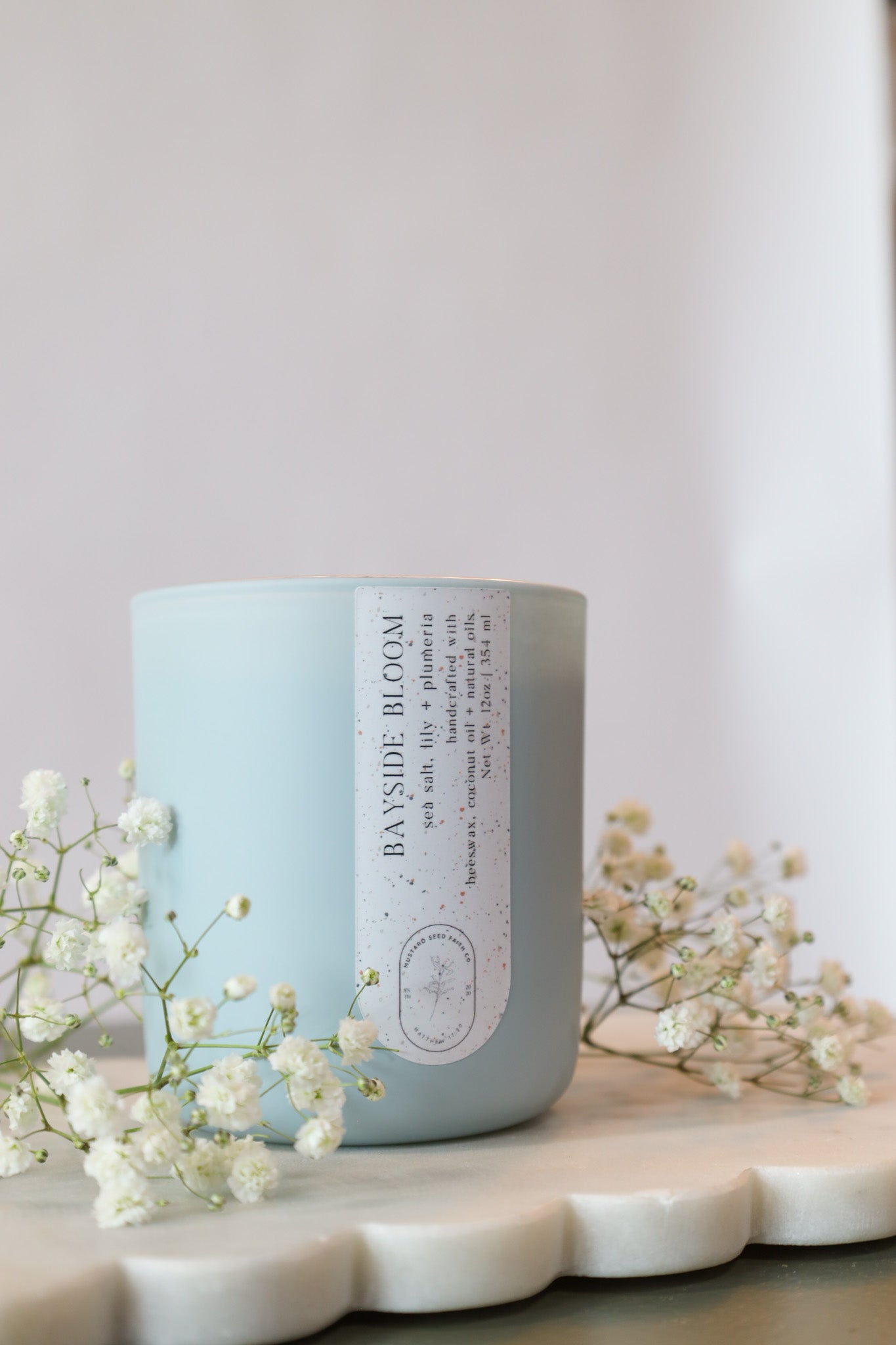 Introducing Bayside Bloom - a candle that transports you to a seaside oasis with its refreshing scent of Sea Salt, Lily, and Plumeria. Let the fusion of these notes fill your room and relax your senses. Bring the beach into your home with Bayside Bloom.