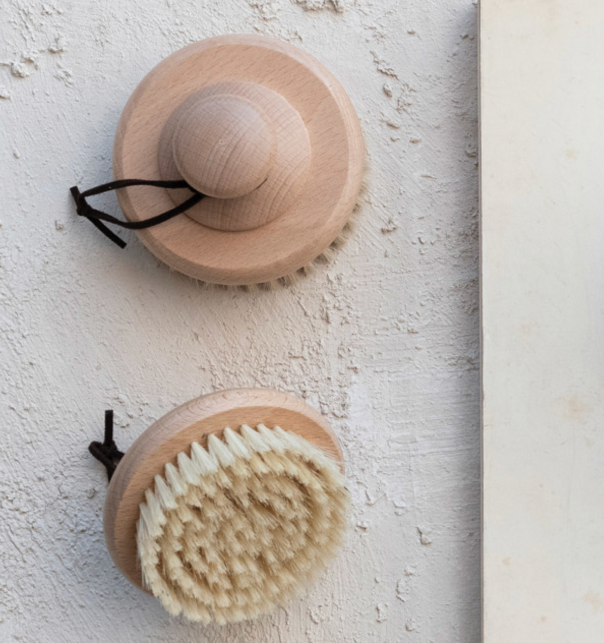 This beech wood body brush with round handle and leather tie in natural color is a practical and beautiful way to pamper the skin. It features a smooth and sturdy beech wood material that is eco-friendly, durable, and water-resistant. The brush has a round handle that fits comfortably in the hand and a leather tie that adds a touch of elegance and convenience. Use this body brush with soap or body wash to create a rich lather and massage the body. It has soft and flexible bristles that gently scrub and exfoliate the skin, leaving it smooth and refreshed. It has a natural color that will match any bathroom decor. Hang it with the leather tie for easy storage and drying. This body brush is a rustic and chic accessory that will enhance the shower or bath experience.