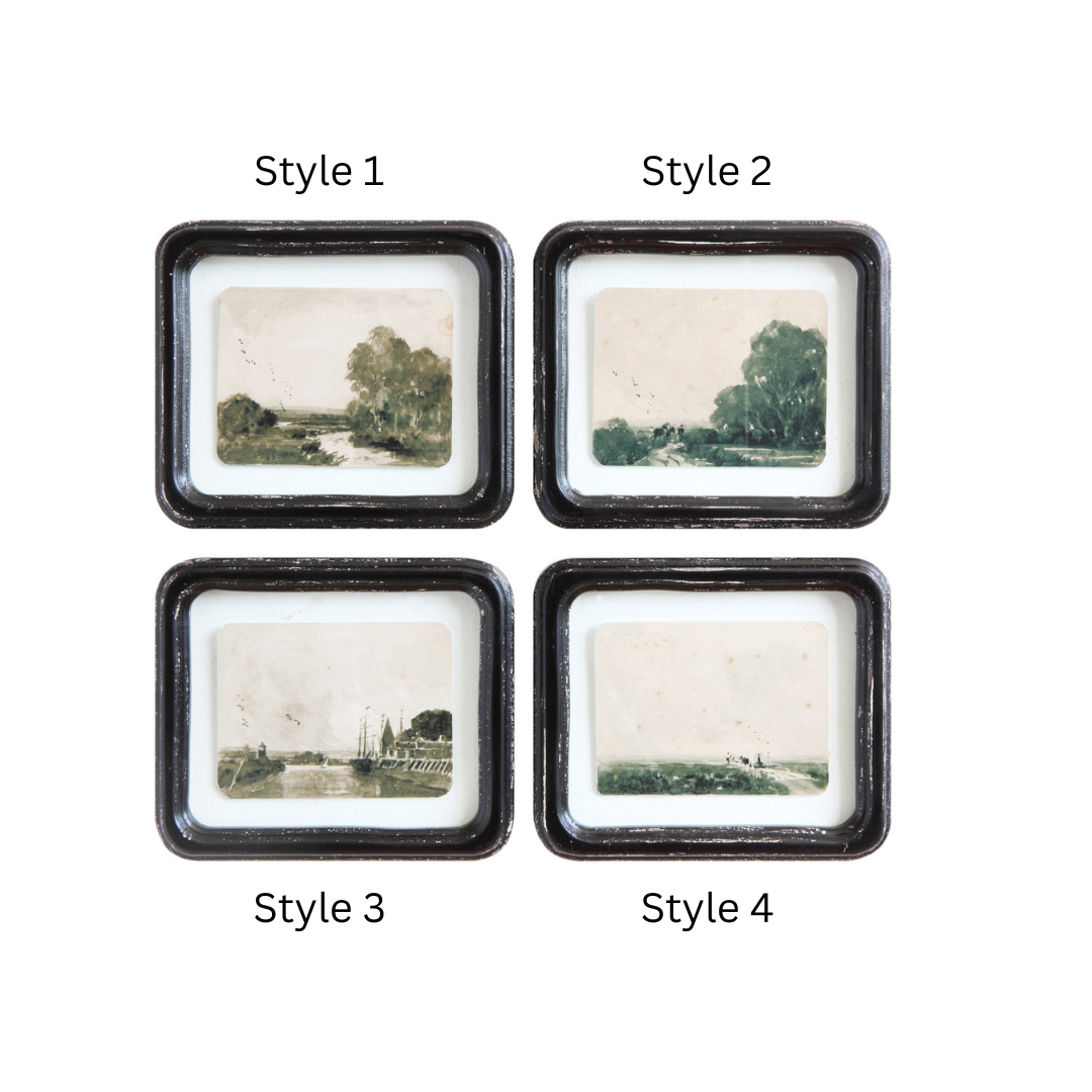 There are 4 individual images of landscape in this set of frames. They each have a distressed black frame. Hang them together in a grouping or in different locations to help tie the space together.