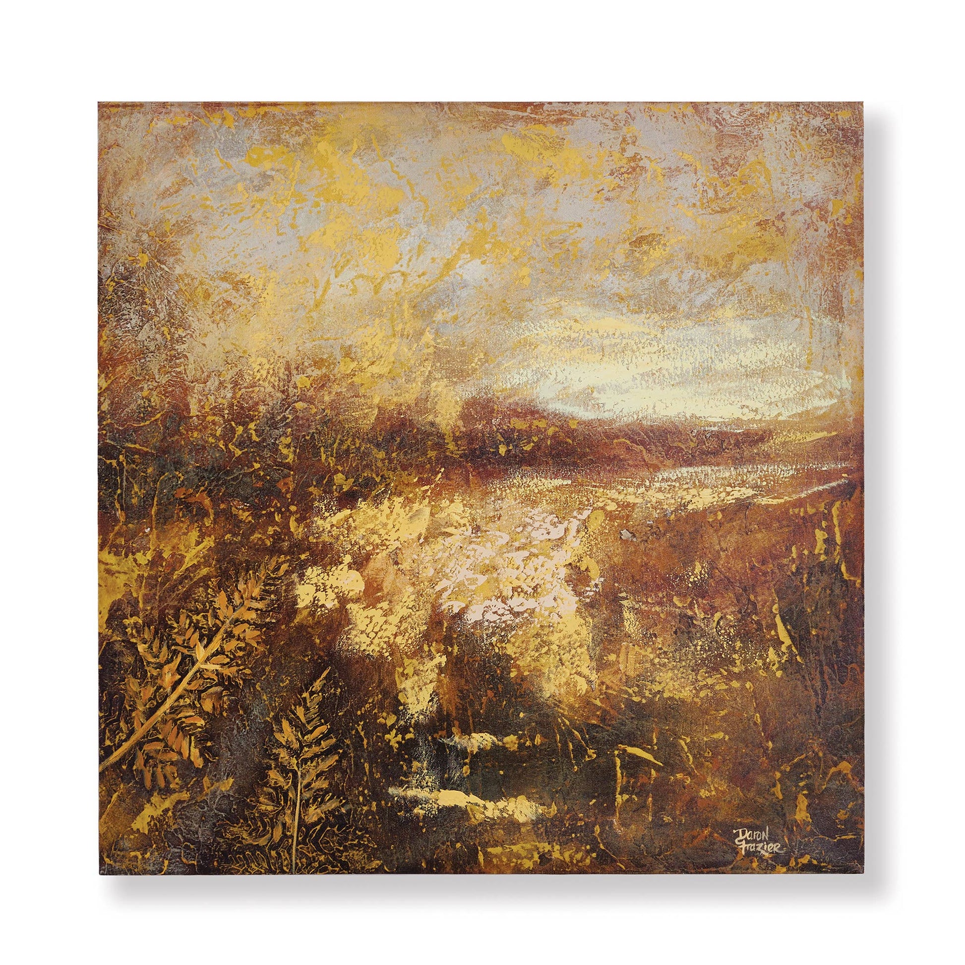 Landscape-inspired with an abstract feel, the work of Daron Frazier is versatile in nature. From transitional to modern, at home in any aesthetic. 23.5 x 1.5 x 23.5. Interior use only. Clean with dry cloth.