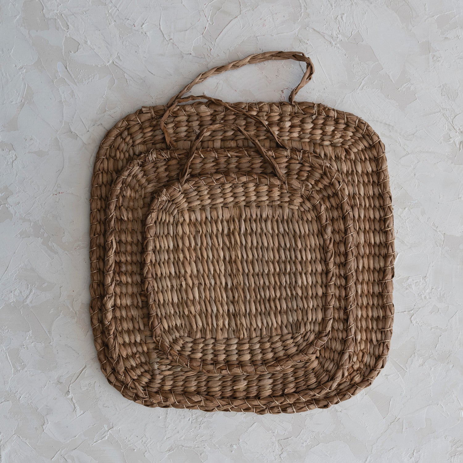 Dimensions: 11", 10" & 7" Square Hand-Woven Bankuan Trivets w/ Handles, Natural, Set of 3