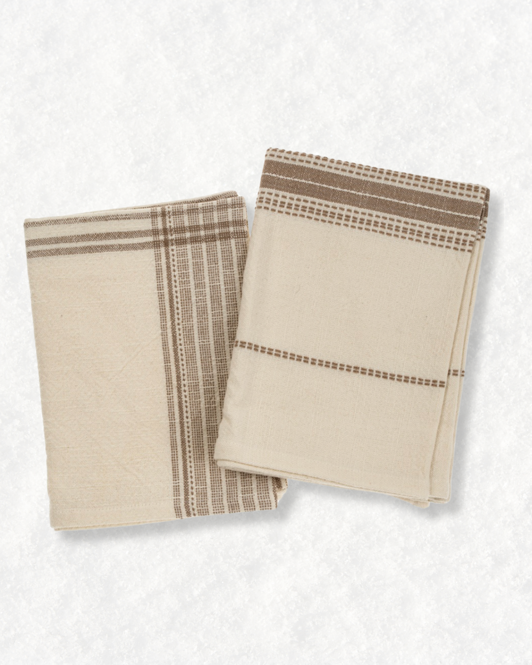 Time for a kitchen refresh? This set of 100% cotton tea towel offers the perfect touch with its absorbent natural fibers and neutral palette. We love the versatility of the simple overlapping stripe pattern, which is accented with hand embroidery - ready to fold into the mix with effortless style. Machine washable.